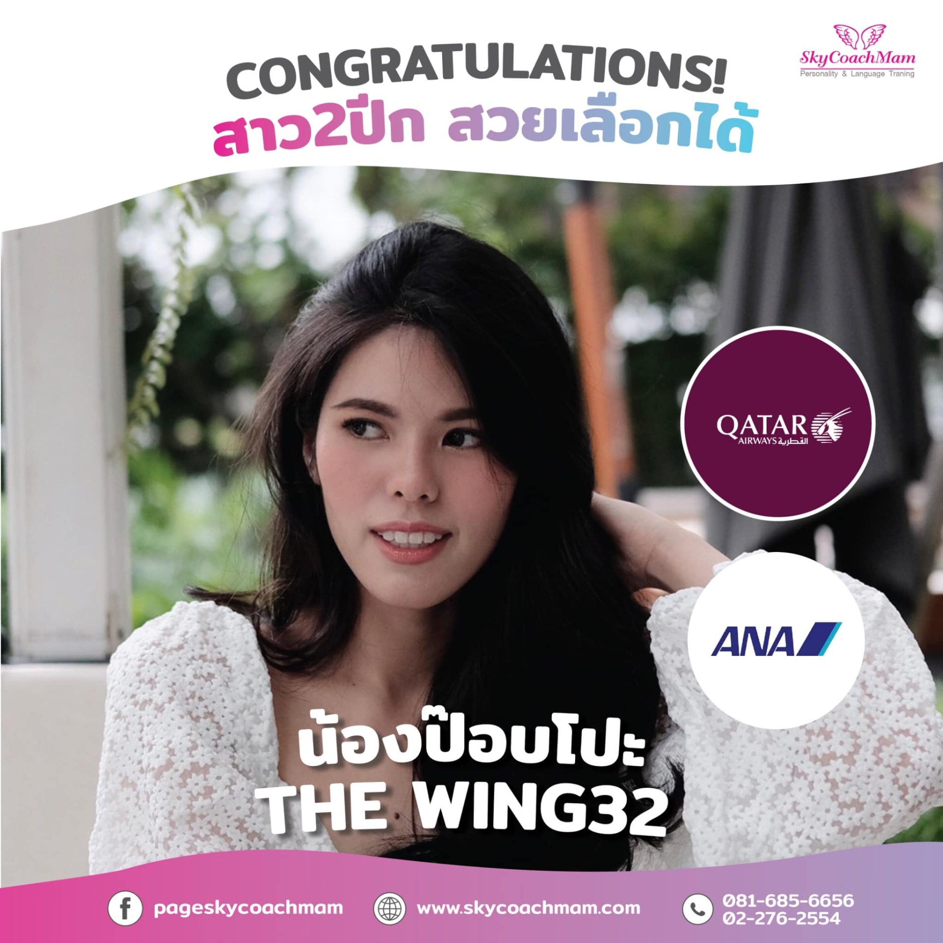 Congratulations! น้องป๊อปโปะ ลูกศิษย์คนสวยจากคอร์ส The Wing รุ่น 32 จากที่ป๊อปโปะเคยคว้าปีกแรก กับสายการบิน5 ดาว ANA มาแล้ว ล่าสุด ป๊อปโปะ คว้าปีก สายการบิน5 ดาว Qatar Airways ได้อีกค่า เย้ เก่งมากๆ แอร์ 5 ดาวสุดๆไปเลย